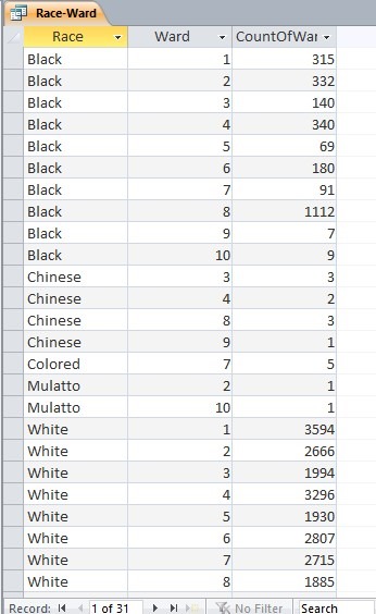 By importing this spreadsheet data into MS Access (above), we have created a truly powerful database that has opened up a wide range of new research questions (below). We can ask about the ethnic diversity of the city in 1900. We can ask what percentage of the Russian-born population spoke English, how many Irish worked at the iron mill, and how female literacy rates compared with male. Closer to home, we can ask about the diversity of the original neighborhood of Messiah College’s Harrisburg campus before the college moved to Grantham.