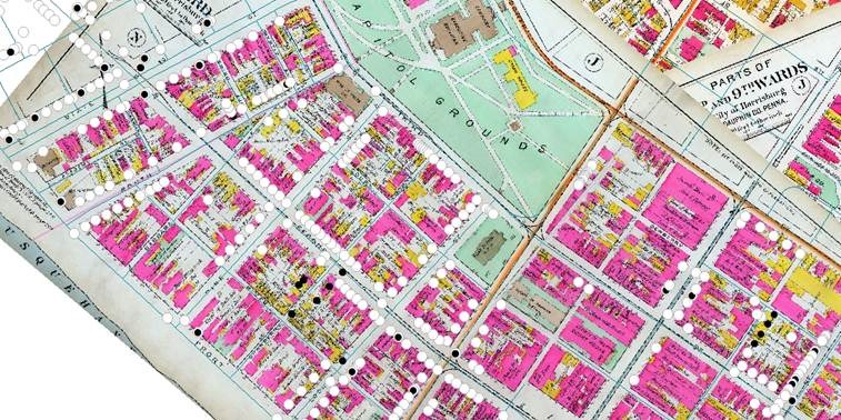 Our student also collaborated with GIS students from other courses to link the census data to a digitized map of the city in 1900. Students from Jeff Erikson’s GIS class here at Messiah completely digitized four wards of the city in 1900. Professor Albert Sarvis’ class in Applied GIS at Harrisburg University georeferenced and geocoded a map of the city in 1900 to display the census data. When the data entry and map is complete next fall, we will be able to project and pattern the population of Harrisburg in 1900 by a wide range of criteria, such as occupation, birthplace, and race (this image below comes from the work of Professor Sarvis’ class). Finally, a student of Professor Nicole Ernst of HACC has been working with Professor Erikson on the broader City Beautiful.