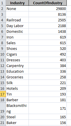 Industry is a facet of modern city life that keeps the economy afloat. Yet, cities are often characterized by their unique emphasis on certain industries. Today, we often associate Pittsburgh with the steel industry or Baltimore with seafood. What can be said about Harrisburg, especially in 1900, a time of industrialization? Dr. Pettegrew and the students in his Digital History classes at Messiah College compiled a federal census database of the residences of Harrisburg in 1900. By querying this data through Microsoft Access we can get a sense of what industry was like in Harrisburg and the people who worked in it.