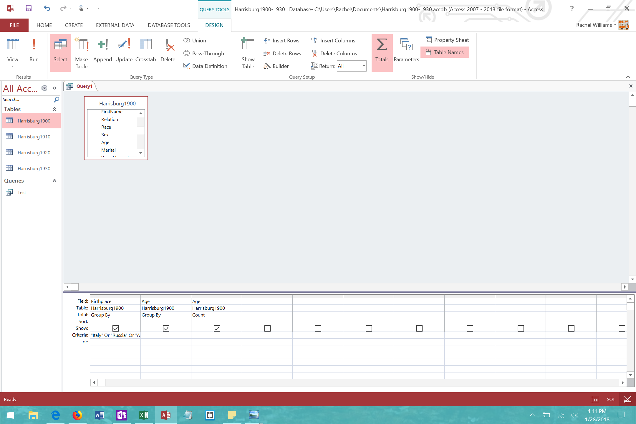 After organizing our collections of photographs, lantern slides, newspaper articles and more in Omeka, we moved onto a new form of presenting information. If you have access to Harrisburg Census records, how do you turn all of that raw data into coherent information for publication? One aptly named database management system, Microsoft Access, lets the user organize and analyze massive amounts of information. This is especially helpful if you are working with a data set like the 1900 population of Harrisburg (which includes 50,168 individuals). Though it may take some getting used to and plenty of trial and error, the query function of this program is extremely useful in learning more about Harrisburg.