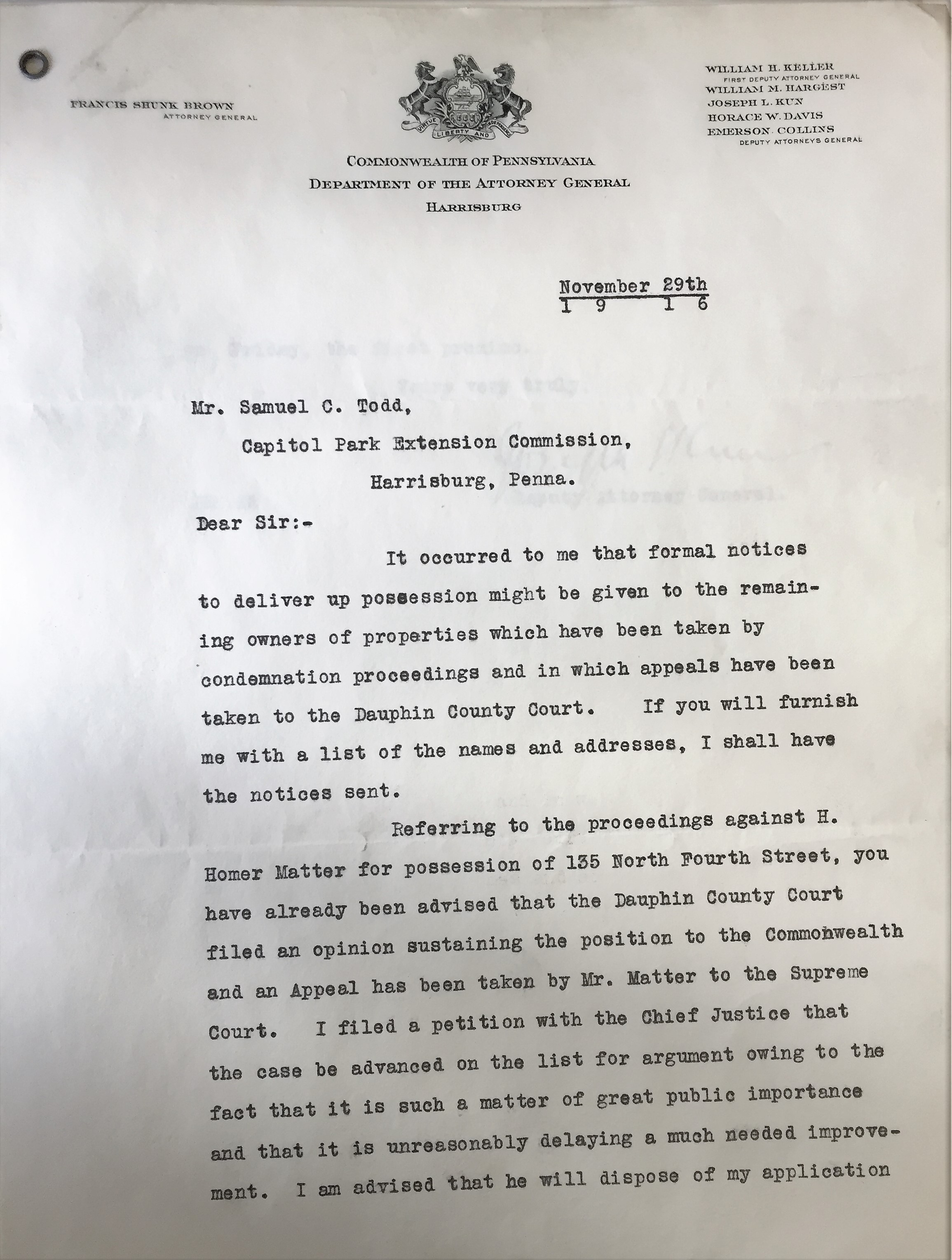 However, for my second exhibition, I wanted to push a little against Wilson’s narrative. While the concept of success tied to the City Beautiful Movement is true to an extent–the movement did result in numerous beneficial changes in the city of Harrisburg–there is another side to the story. Along with the improved streets, water system, available green space, and more, there were evictions, displacement, and demolition. I decided to explore the Old Eighth Ward and its destruction over the course of the 1910s for the extension of the Capitol complex.