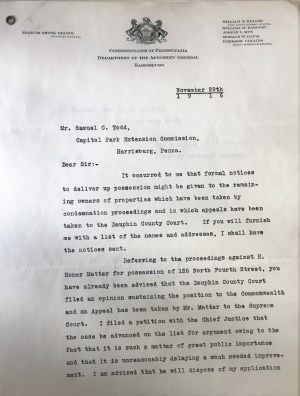 The new Capitol and its surrounding area is a magnificent feature of modern Harrisburg. However, the consequence of such beauty was the displacement of hundreds of Harrisburg families. The archivists at the Pennsylvania State Archives expressed a willingness to share information about the Old 8th Ward, so that is how I found my archival research. Since I was unwell at the time, my friend and classmate Sarah took lots of photographs from a record group at the PA archive. I put together three collections in the hope that it would make the website visitor feel like they were walking through the shadow of a neighborhood that is long gone. In addition to this information, I included a demographics page to show trends in the movement of people as a result of the Capitol Park construction. Finally, I added GIS information to give a visual of the ward’s change over time by viewing a single address to represent the whole of buildings lost.”