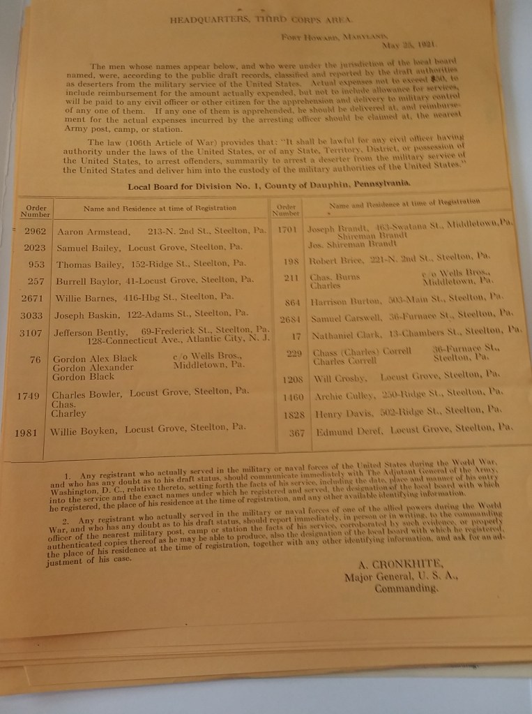 Interspersed throughout the collection were lists of deserters, dated to May 25, 1921, with orders to apprehend the men listed on them (as long as the expense of doing so did not exceed $50). It is unclear if the men deserted while in Europe or if they were simply missing when it came time to be shipped out. A disproportionately large number of these deserters were listed as being from Steelton, a small industrial town about four miles south of Harrisburg. I was very curious as to why this was. Currently, my running theory is that Steelton was home to a large number of recent immigrants who were not invested in the United States’ entrance into the war. They would have resented a draft that might pit them against former fellow countrymen or even friends and family. This will require more research to confirm, however. I am also interested in finding out if any of these men were apprehended and if so what happened to them. With the archives now closed, however, it seems unlikely I will get the chance to do this.