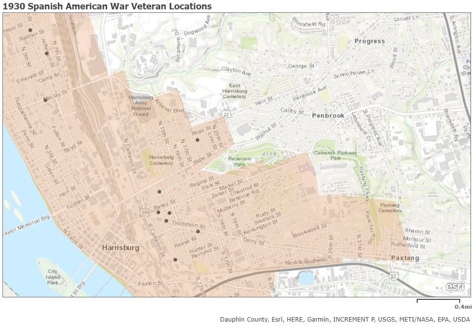 As I have been working through this semester, a good portion of my focus has been on the veterans of the Spanish American War. Back in early April, I posted about my idea for a final project where I track some of the veterans who served in the Spanish American War. Bridging to that idea, I later went through the 1930 census and made a blog post showing some of the statistics about the veterans living in Harrisburg at the time. In doing so, I gained a better understanding of how to utilize tools such as Microsoft Access. With this previous experience, I went through the Muster In and Out calls for the Governor’s Cavalry which was made up primarily of Harrisburg residents. Using the roll in conjunction with the census, I was able to map out where the soldiers lived after returning from war, how they moved over the course of 30 years, what their jobs were and if they changed, how their marital status changed, and how many of them stayed in Harrisburg. My final project can be found here.