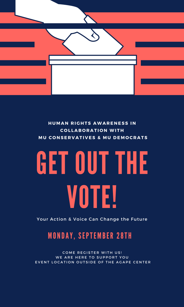 As we celebrate the 150th anniversary of the 15th amendment and the 100th anniversary of the 19th amendment, the Center for Public Humanities has partnered with the Student Government Association <link> as well as the MU Democrats and MU Conservatives for a voting drive across campus — both in a physical and digital space.