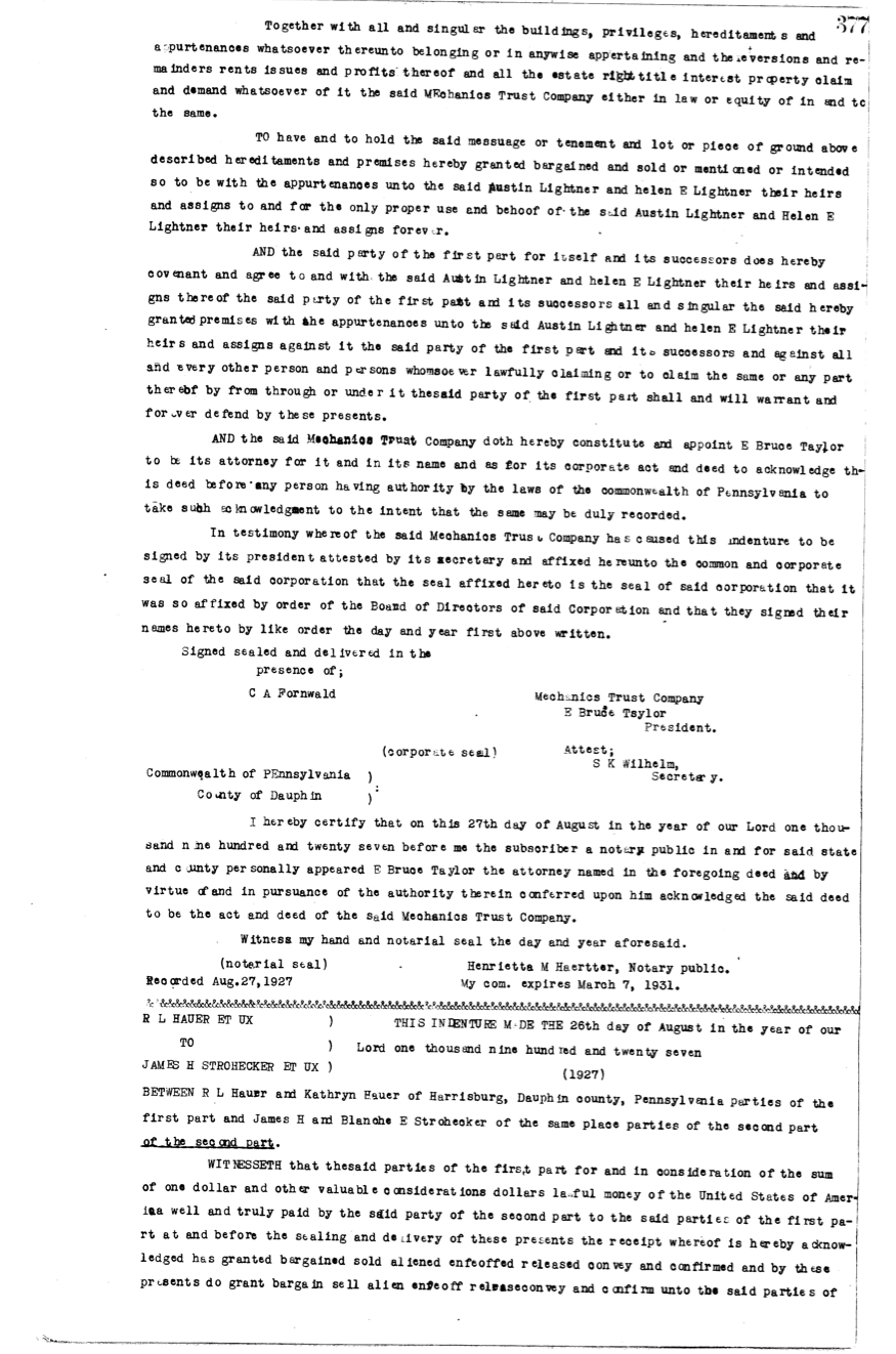 This deed was issued by R.L. Hauer to James M. Strohecker in 1927. While most of the deeds I found were issued in 1936, 37, and 39 (after the HOLC map was made), there were some between individual citizens that appeared before that.
