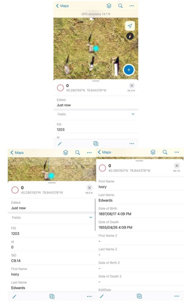 Professor Sarvis and I inspecting a gravestone’s inscriptions while test-running ArcGIS Field Maps mobile app on our phones. We were attempting to discern how far off the location of the stone was from the points on the map as we realized the map-stone location accuracy was not perfect.