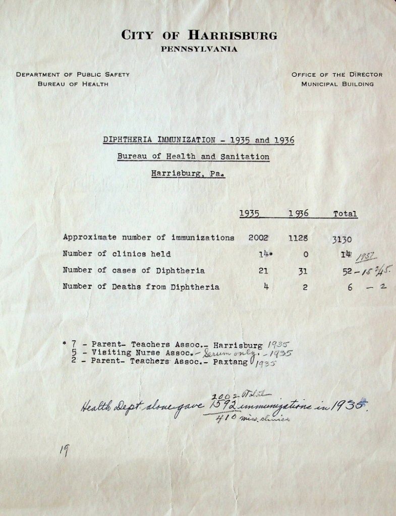The materials I looked at in each archive were very different from each other. In the state archives, there were these huge books coming from the early 20th century. I mostly just looked at one book that had all the records of people that were sick. It told me their name, what they had, where they lived, their age, how long they were quarantined, and if they died. In the Dauphin County archives, they were little pamphlets from the late 19th century to early 20th century. Here I looked at the annual reports that told me how many cases of contagious illnesses they had throughout the year so I can find a pattern.