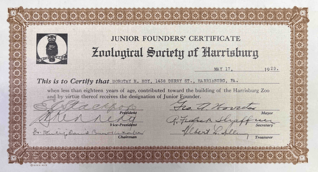 Above: An image of a Junior Founder’s Certificate presented to Dorothy Hoy on May 17, 1929, for being a donor to the Harrisburg Zoo.