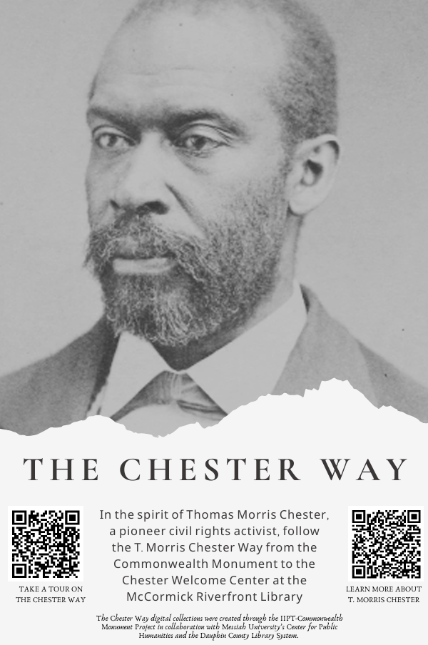 The Chester Way poster has the portrait of T. Morris Chester on it with two additional QR codes, one to his life’s “story map”, and the other to a civil rights walking tour of the capital district and the Harrisburg area.