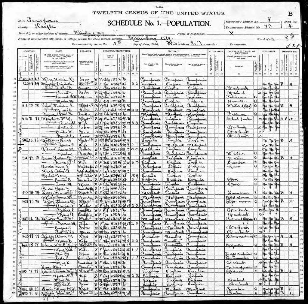 Places of Residence: Harrisburg, Pennsylvania: 516 Spruce Street, 631 Boas Street, and 825 N. 6th Street.