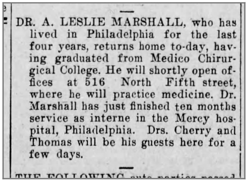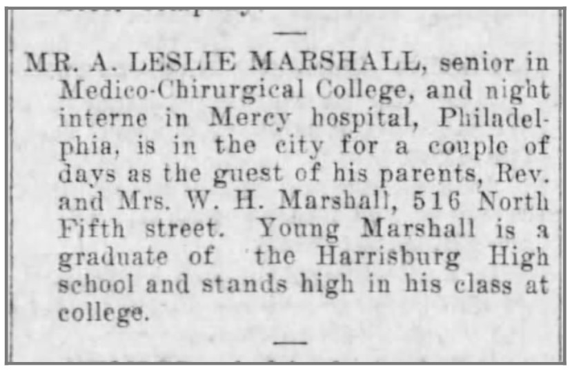 Education: Central High School, Harrisburg, 1905. Medico-Chirurgical College (later merged with University of Pennsylvania), 1910; residency at Mercy Hospital.