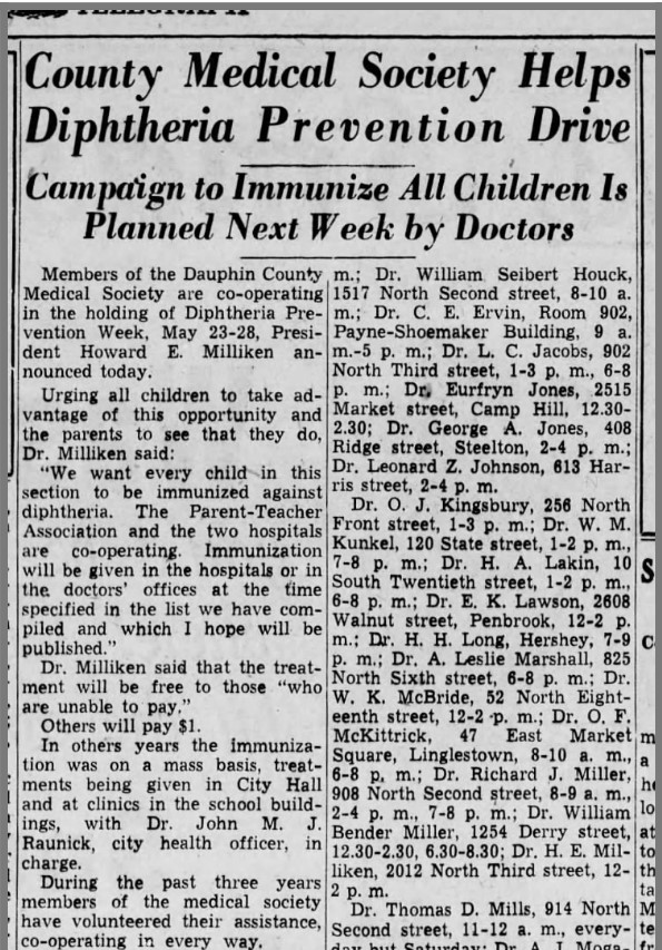 Activism: Colored Knights of Pythias; Central PA Medical Society (secretary); National Medical Association (vice president); Forster Street YMCA (president); Westley Union A.M.Z. Zion Church (treasurer); Republicans precinct committee, 8th Ward (secretary); Dauphin County Civic and Progressive League (chairman); WPA Folk Council, Festival of Nations (chairman); Auxiliary Disaster Committee of Harrisburg Red Cross Hall Johnson Negro Choir (officer)l Clinic Committee of Tuberculosis and Health Society of Harrisburg; Housing Association of Harrisburg (executive committee); Scoutmaster and founder of colored Boy Scouts in Harrisburg; Cosmopolitan Chorus, Westley Union A.M.E. Zion Church (advisor); Junior Colored Baseball League (president); Community Choral Society (chairman); NAACP, Harrisburg chapter (vice president).