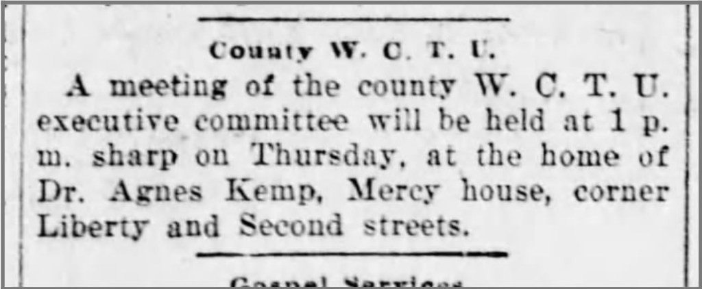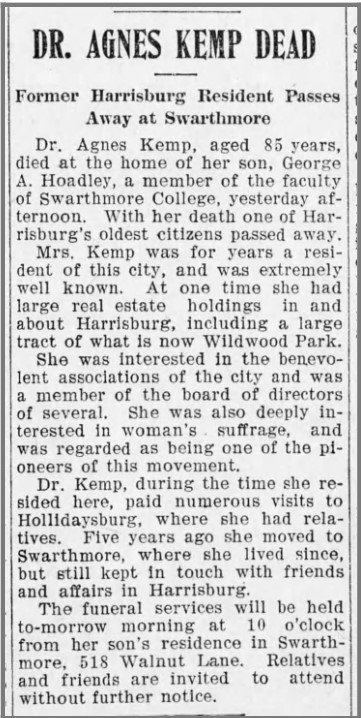 Activism: Dedicated to temperance, virtuous living, and women’s suffrage; spoke at the celebration of the passing of the Fifteenth Amendment in Harrisburg; gave Wildwood Park to the city of Harrisburg; selected as delegate to Women’s National Council in Washington D.C. 1899; abolitionist; founded Magdalene asylums, home for women, and Women’s Christian Temperance Union in Harrisburg.