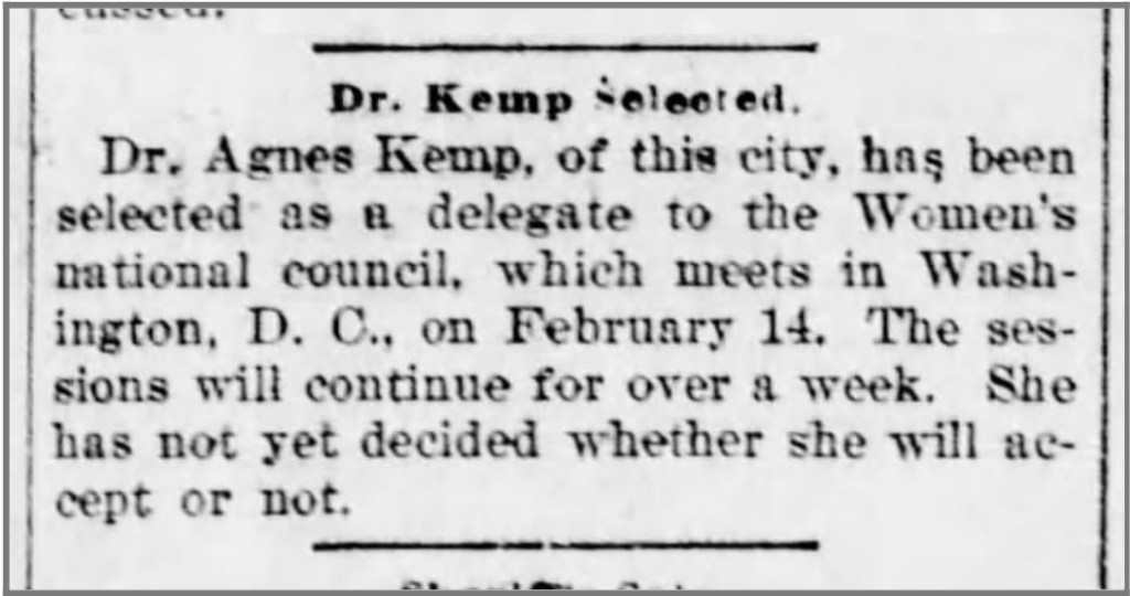 Family Members: Father: Anthony Nininger (1816-1868). Mother: Catharine May Nininger (died when Agnes was an infant). Brother: John Nininger. Husband: M1: Colonel William Saunders, died. Husband: M2: Joseph Kemp (18600. Children: Marie Antoinette Kemp, and two children who died in infancy.