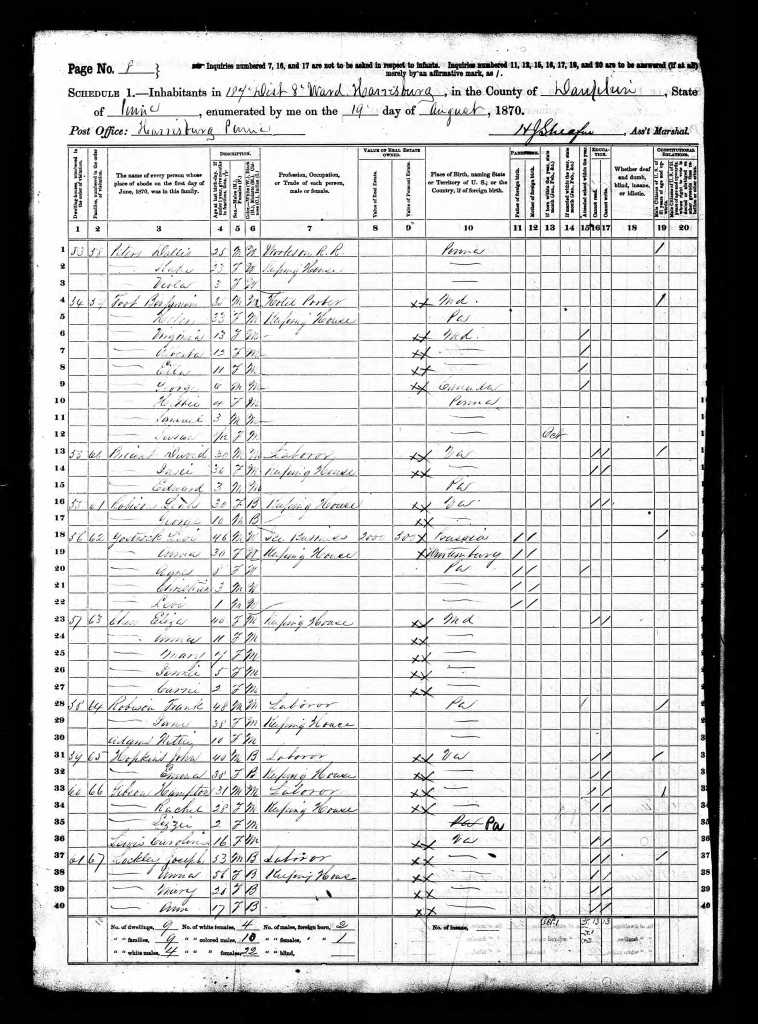 Places of Residence: Harrisburg, Pennsylvania: N. 4th Street & North Street (1867), 502 South Street (1876-1882), 106 Short Street (1885-unknown), 517 State Street (1886-1887), 127 Cranberry Avenue (1889-1893), 626 Walnut Street (1894-1897), 426 State Street (1899), and 515 E. State Street (1901).