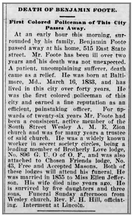 About Me: “He was the first colored policeman of this city and earned a fine reputation as an efficient, painstaking officer. For upwards of twenty-six years, Mr. Foote had been a consistent, active member of the South Street Wesley A.M.E. Zion Church and was for many years a trustee of said church. He was a widely known worker in secret society circles…” Harrisburg Daily Independent, May 23, 1901.