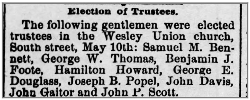 Connection to the Old Eighth Ward: Resident; involved in social political organizations; member of Wesley Union A.M.E. Zion Church.