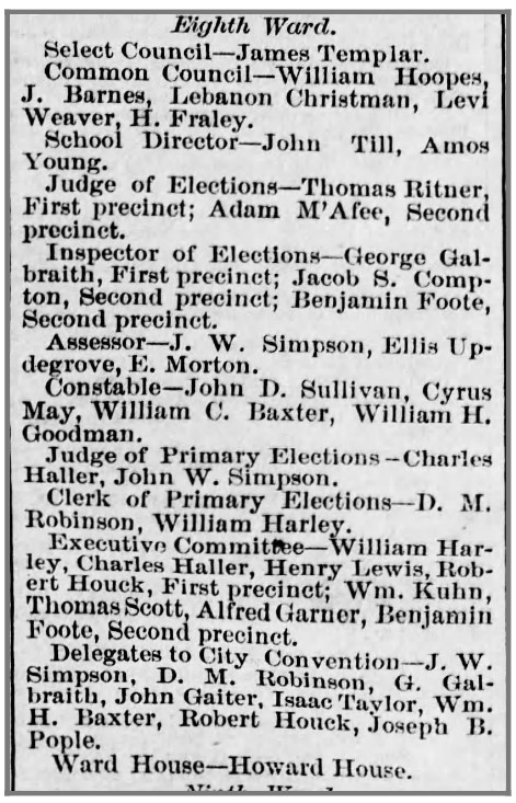 Occupations: Confectioner. Tobacco and Cigar salesman. Hotel porter. Inspector of Elections, Second Precinct (1875). Policeman.
