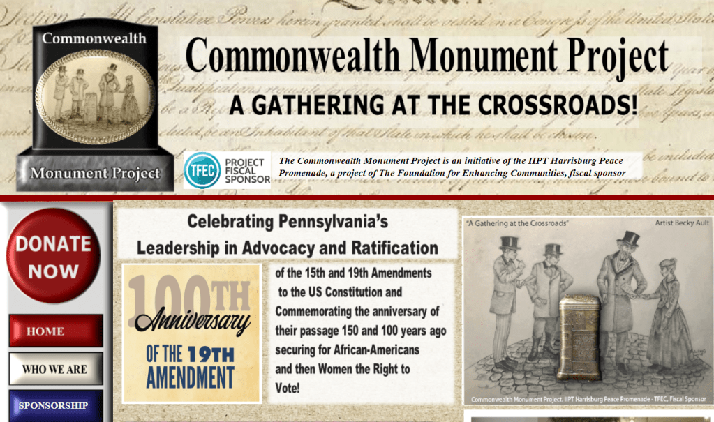 The organizer for Pennsylvania’s Commonwealth Monument Project was the IIPT Harrisburg Peace Promenade, a project of the Foundation for Enhancing Communities, fiscal sponsor. The Digital Harrisburg project, a collaborative initiative of Messiah University and Harrisburg University of Science and Technology, has contributed to this project through the support of those institutions and a Council of Independent Colleges grant (Humanities Research for the Public Good) funded by the Andrew W. Mellon Foundation.
