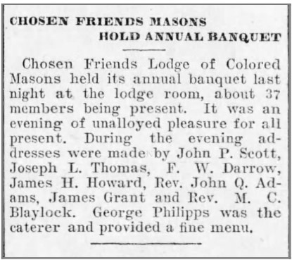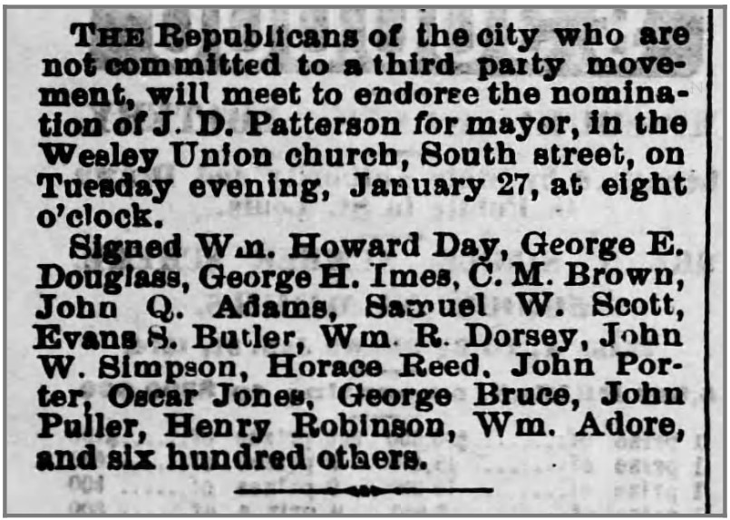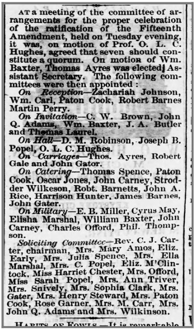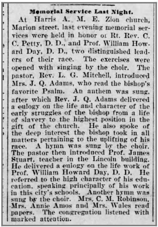 Connections: William Howard Day, Joseph Thomas, John P. Scott, Josephine Bibb, James Grant, W. Justin Carter, James Auter, Dr. William H. Jones; Morris H. Layton Sr., Cassius Brown, Ida Brown, James H.W. Howard, James Stuart, William H. Marshall, George Imes, Joseph Popel, John Gaiter, O.L.C. Hughes, Joseph Compton, John W. Simpson, Charles Carter, Anne E. Amos, Aquila Amos, David Stevens, Zachariah Johnson, George Galbraith.