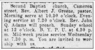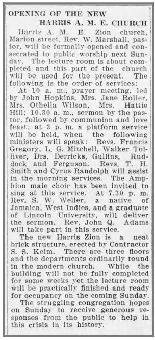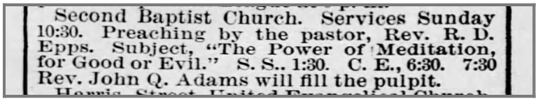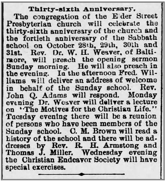 Connection to the Old Eighth Ward: I served as minister at Wesley Union A.M.E. Zion Church in the Old Eighth Ward, preached at Second Baptist and Capital Presbyterian Churches, and was involved in numerous organizations that met in the Eighth Ward.