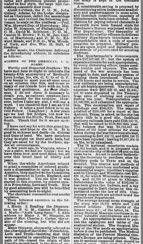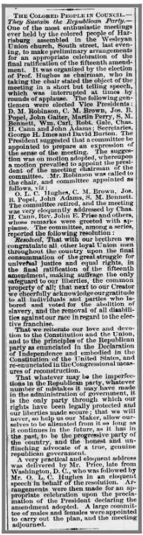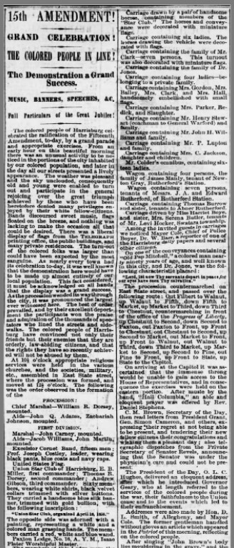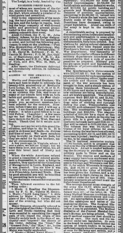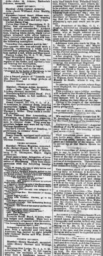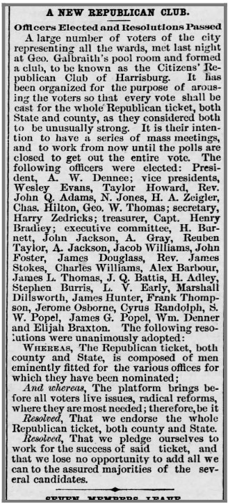 Activism: I was involved significantly with the Masons and Odd Fellows. I was connected to the Underground Railroad and gave the prayer at Harriet Tubman’s funeral. I was a founding member of the Colored Protective League of Harrisburg and the Citizens Republican Club of Harrisburg.