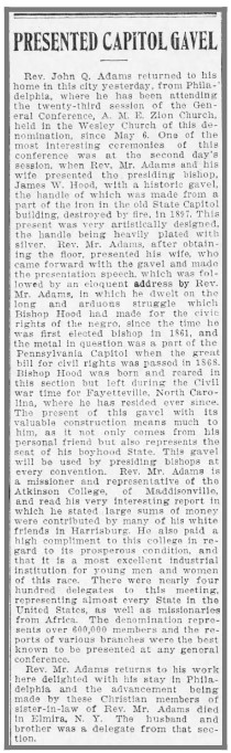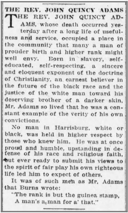 About Me: “No man in Harrisburg, white or black, was held in higher respect by those who knew him. He was at once proud and humble, upstanding in defense of his race and religious faith, but ever ready to submit his own views to the spirit of fair play his own righteous life led him to expect of others. It was of such men as Mr. Adams that Burns wrote, ‘The rank is but a guinea stamp, / A man’s a man for a’ that.” – Harrisburg Telegraph, January 13, 1917