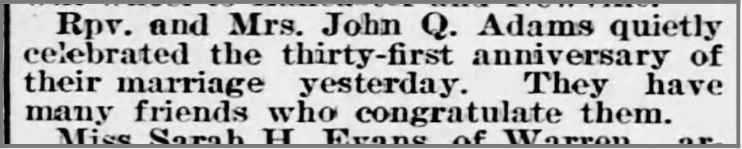 Family Members: Brother: Aaron Adams. Sister: Sallie Adams. Wife: Frances “Fannie” Adams, married in Elmira, NY on June 21, 1866. Sister-in-Law: Nancy Stover.