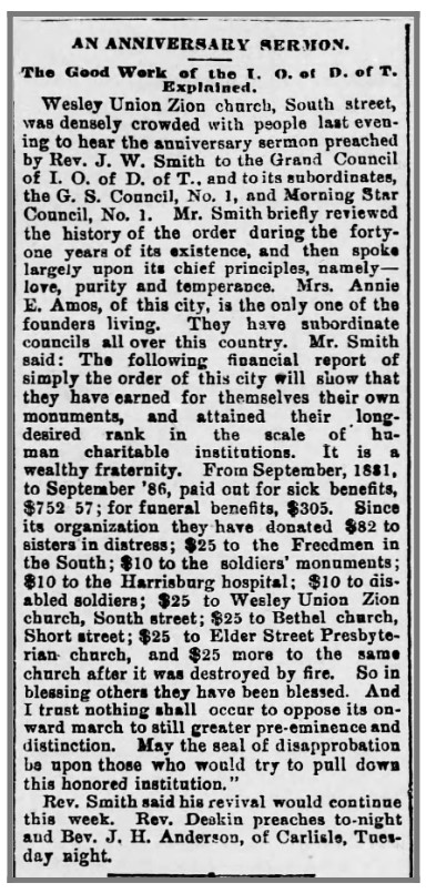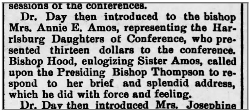 “For each moment of flitting time, each pulsation of the heart some lonely traveler of this mundane sphere loosens the grasp of the things of earth and sinks into eternity. Through one of the opened portals Sister Amos, with outstretched wings swept to a life where Jesus is, to immortality. Hers was a picturesque character, sturdy, independent, positive and aspiring…. In the outer affairs of human life she was an abolitionist and her husband, whose home was an underground station, was often beaten and at one time incarcerated for acts under the fugitive slave law…. She was a suffragist in her church and the women of the Zion church owe a debt of grattitude to her. Should her memory not be held sacred?” — Pittsburgh Courier, Obituary by J.P. Scott, April 1, 1911.