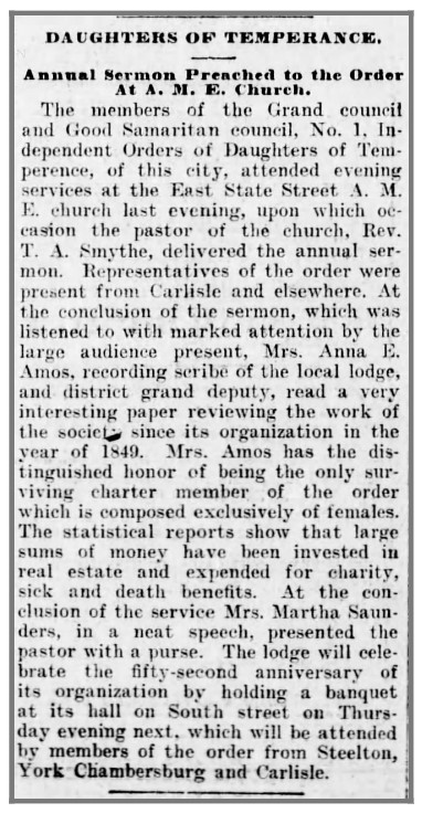 Activism: Activism: Independent Order of Daughters of Temperance; Elder Street Presbyterian Mite Society; Garnet League; Women’s Christian Temperance Union.