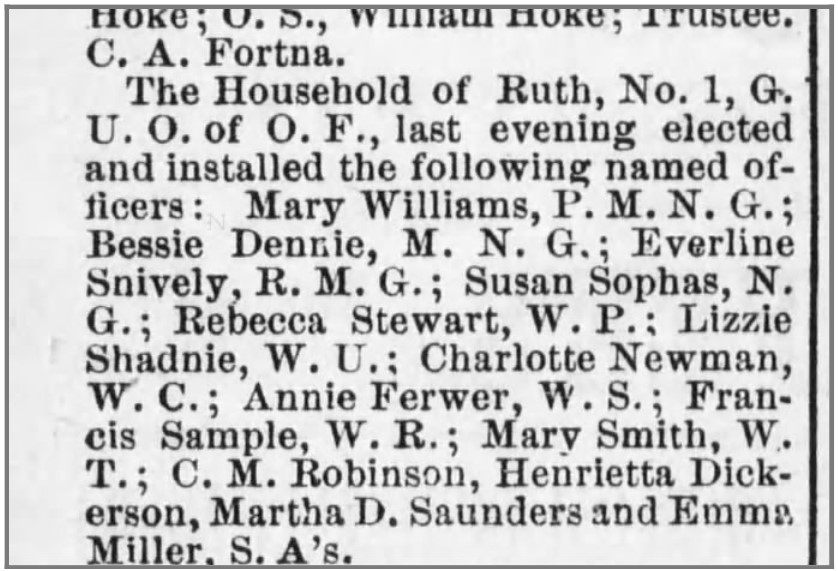 Connections: Household of Ruth, No. 1 with Josephine L. Bibb. Joseph B. Popel, Joseph Thomas, John P. Scott, Morris Layton, Sr., William H. Marshall, Benjamin Foote, John W. Simpson, Cassius M. Brown, John Gaitor, and William Howard Day.