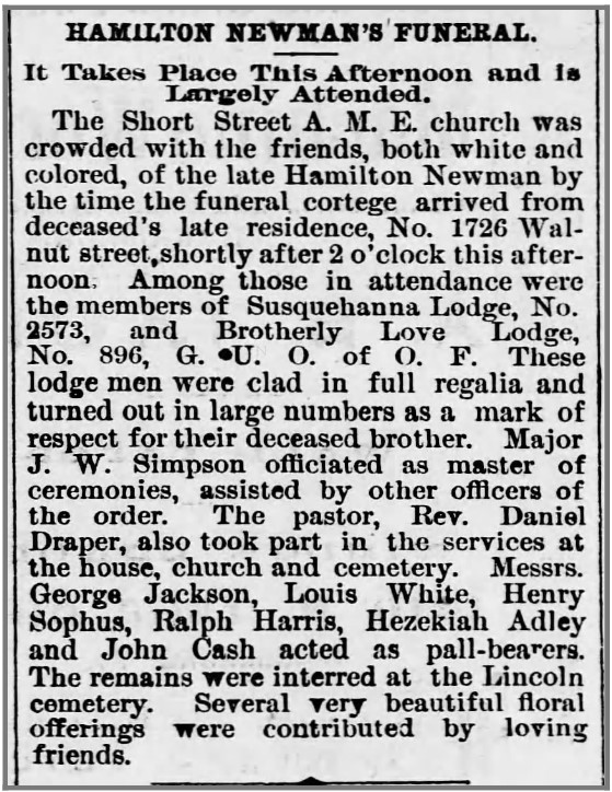 My Contribution: I was an active leader in the Household of Ruth, No. 1, a women’s organization that worked alongside the Grand United Order of Odd Fellows. I belonged to the Household of Ruth at a time when discrimination kept Black people out of fraternal or- ders. I also supported the work of my husband, Hamilton Newman, to extend political rights to people of color in my community.