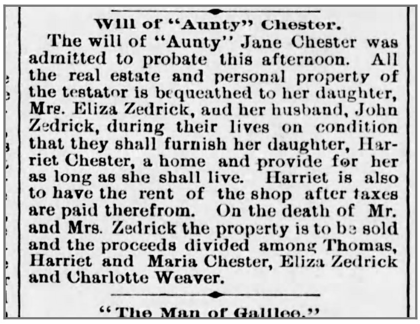 Connections: Connections: Jane Chester (mother), Thomas Morris Chester (brother), David R. Chester (brother), Amelia Chester, Eliza Zedricks (sister).