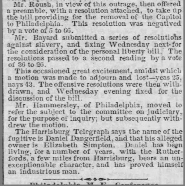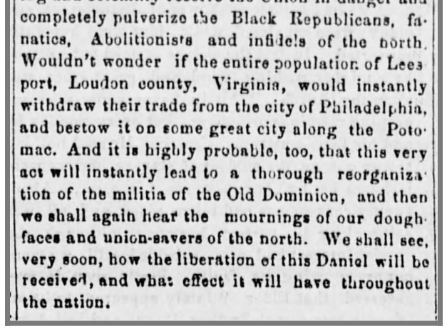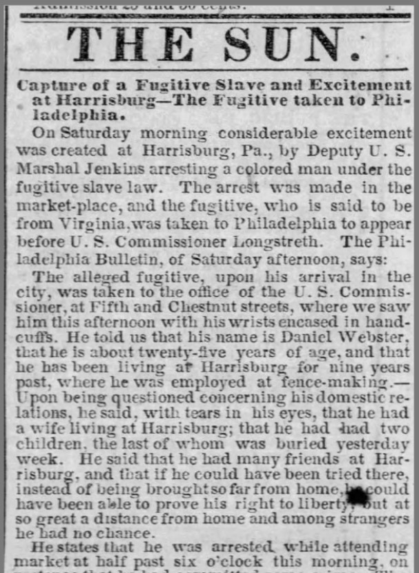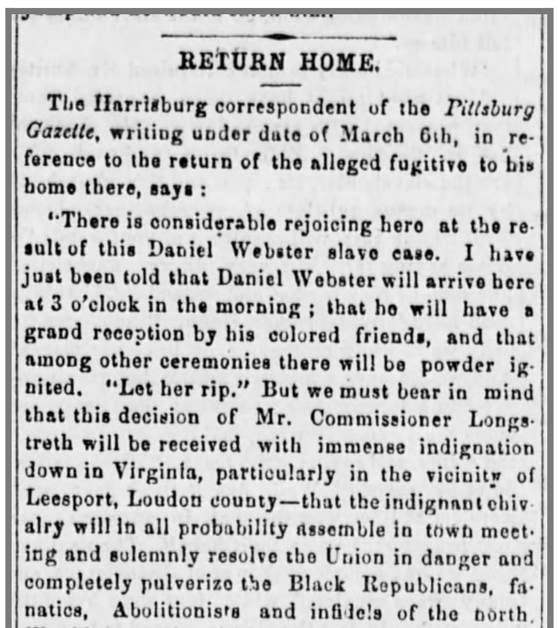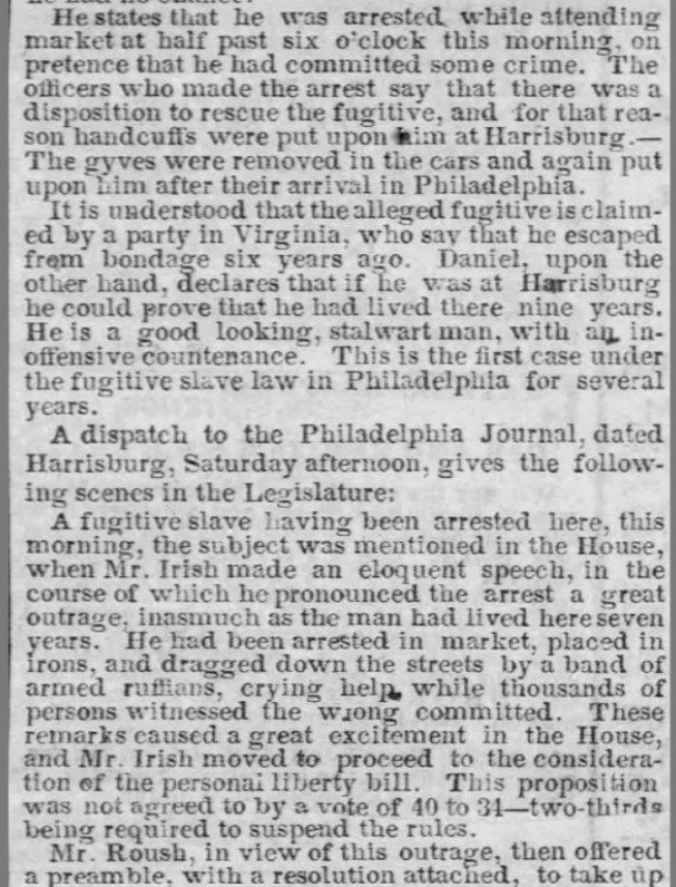 About Me: “When the commissioner commenced, many sympathizing ladies, who were expecting that Daniel would be sent to Virginia, were ‘like Niobe, all tears.’ Presently their eyes brightened, as the Commissioner progressed, and when, finally, he ended by saying, in a calm, pleasant way, “The prisoner is being discharged,” one wild storm of applause broke it. It was in vain the officers called, or Marshal Yost screamed at the top of his voice. One weak lady with a very strong voice ran to the window and called out,— ‘He’s free! he’s free! Give three hearty cheers!’… A crowd of colored people took hold and paraded him around the streets, as was done to Fanny Ellsler many years ago. The enthusiasm was kept until a late hour of the night— general joy was manifested by his friends at the unexpected result…. For a time we really feared that the man would be smothered by his friends, not less than a thousand whom departed up Fifth street with Daniel borne upon the shoulders of a friend in the middle of the group.” — The Daily Exchange, April 8, 1859.