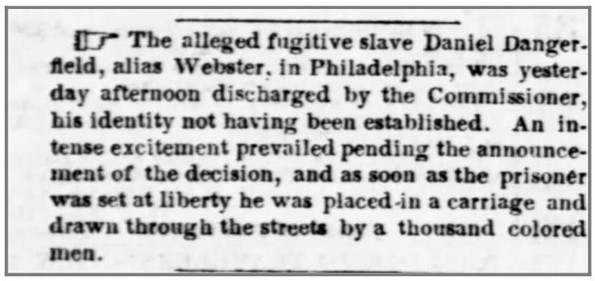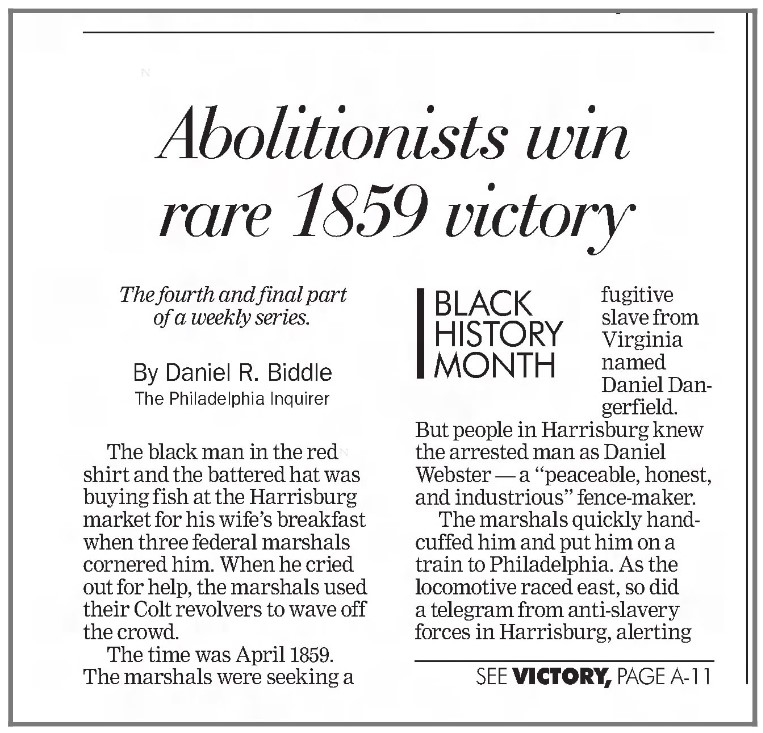 My Legacy: I left an important legacy about the fundamental value of freedom that generated widespread interest across the Commonwealth in the year before the start of the Civil War. I gained my freedom despite the inequitable Fugitive Slave Act. I generated in- credible enthusiasm for abolitionism as Pennsylvania communities of color and abolitionists rallied around my case: witnesses came from Harrisburg to testify, thousands gathered at the courthouse in Philadelphia, others gathered in prayer, and supporters raised $1,000 to purchase my freedom if the judge had not acquitted me.