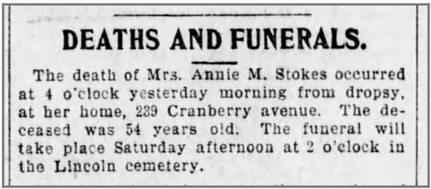 Wife: Ann/Annie M. (Robinson) Stocks. Children: Joseph Stocks, Clara E. Stokes, Frank S. Stokes, Clara E. Stokes, Theopolis Stokes. Grandchildren: Lawrence Stokes, Frank S. Stokes, James A. Stokes. Son-in-Law: Henry Smith