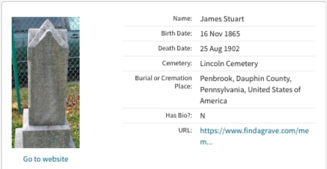 Death Date: August 25, 1902 (died suddenly in New York City, buried in Lincoln Cemetery, Penbrook, Pennsylvania)