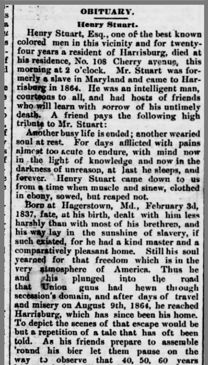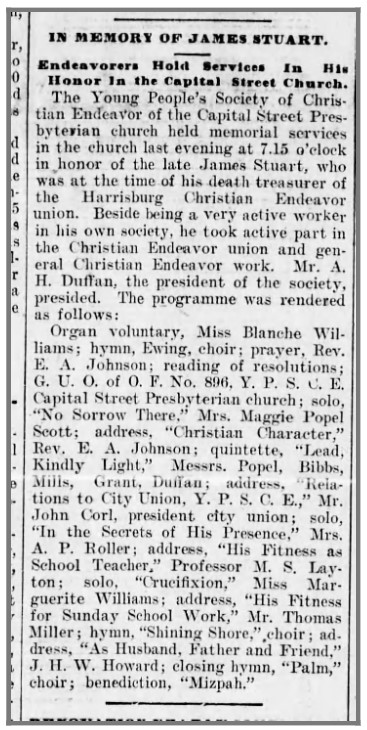 About Me: “The Young People’s Society of Christian Endeavor of the Capital Street Presbyterian church held memorial services in the church last evening at 7.15 o’clock in honor of the late James Stu- art, who was at the time of his death treasurer of the Harrisburg Christian Endeavor union. Beside being a very active worker in his own society, he took active part in the Christian Endeavor Union and general Christian Endeavor work.” — Harrisburg Daily Inde- pendent, September 29, 1902.