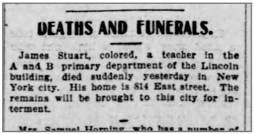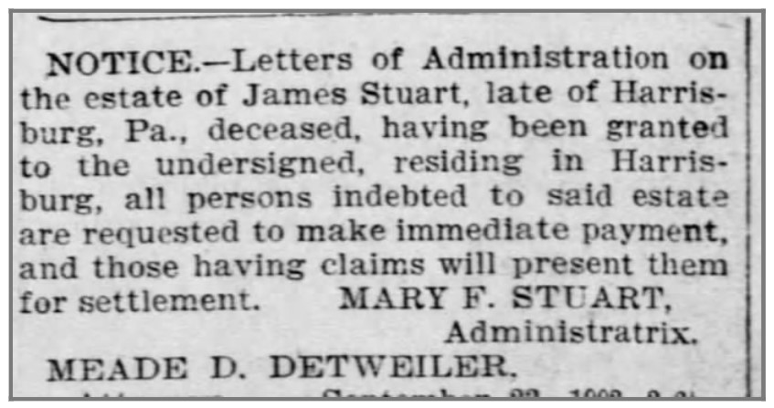 Family Members: Father: Henry Stuart, b. February 3, 1837 in Hagerstown, Maryland. Mother: Eliza Stuart, b. in Maryland ca. 1839. Siblings: Augustus Stuart, Daniel Stuart, Lillie Stuart, Harriet Stuart, and three others. Wife: Mary F. Stuart, b. 1871. Son: James E. Stuart, b. ca 1894