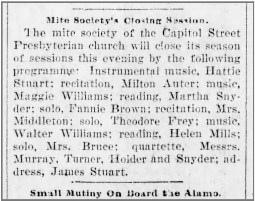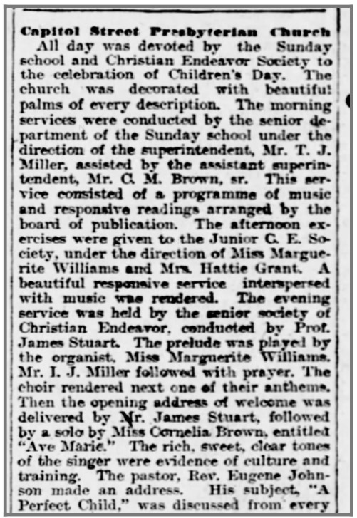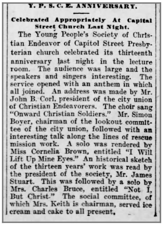 Activism: Young People’s Society of Christian Endeavor of Capital Street Presbyterian Church (president and treasurer).