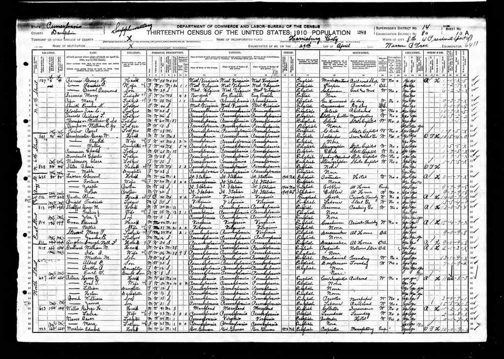 Places of Residence: Harrisburg, Pennsylvania: 108 Cherry Avenue (1880-1888) and 814 East Street (1900-1902: owned property).