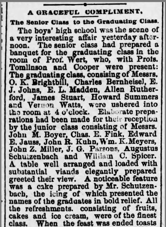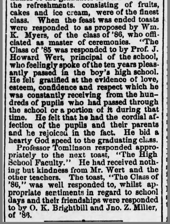 Education: Harrisburg High School, 1885 (delivered oration on the theme of “No Peace Without Union”)