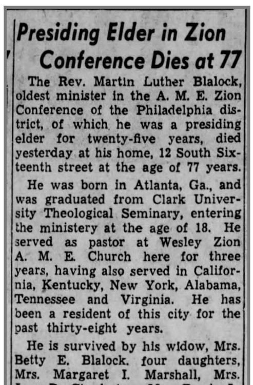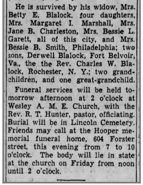 Family Members: Grandmother: Marga- ret Williams. Father: Rev. Martin Luther Blalock. Mother: Betty E. (Scott) Blalock. Siblings: Margaret (Blalock) Marshall, Bessie Blalock, Martin Luther Blalock, Der- well Blalock, Rev. Charles Blalock, Mary Blalock. Husbands: M1: Layton Leroy How- ard (d. 1918), M2: Oscar Charleston