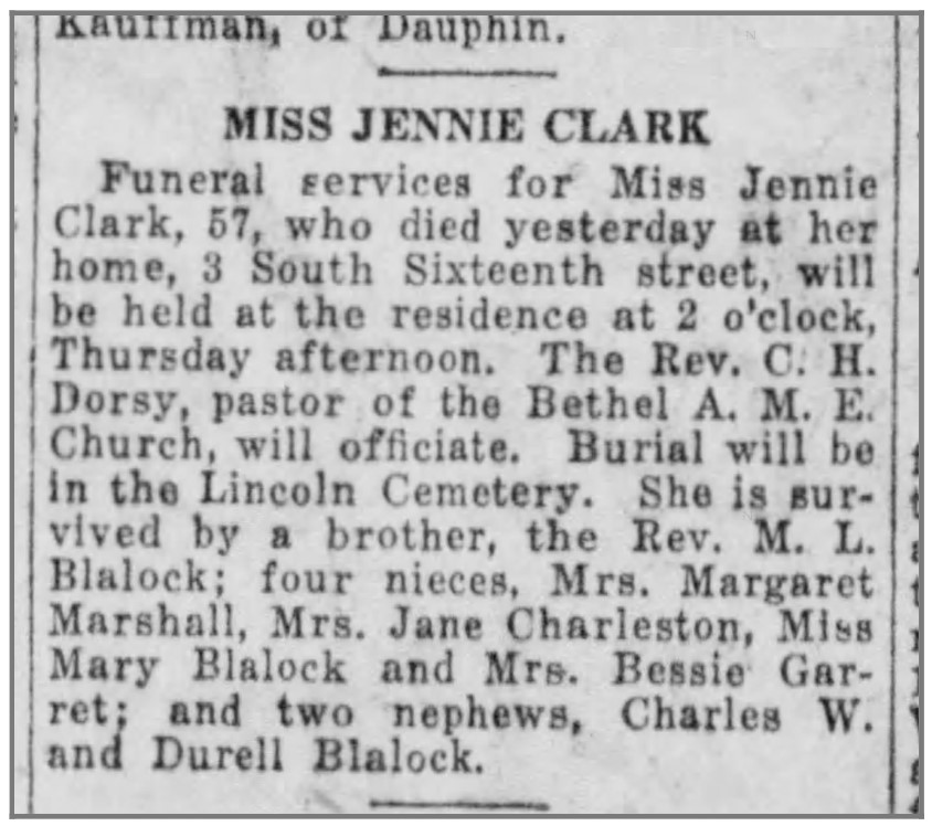 Connection to the Old Eighth Ward: Connection to the Old Eighth Ward: Daughter of Martin Blalock, prominent pastor of Wesley Union A.M.E. Zion Church; school teacher in the com- munity and active in social organizations