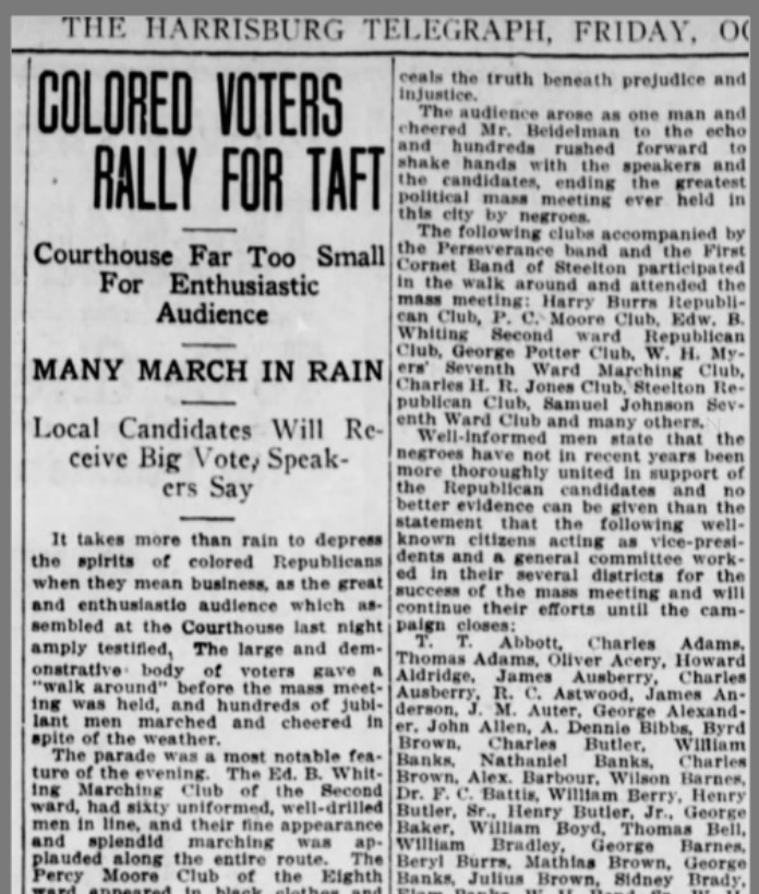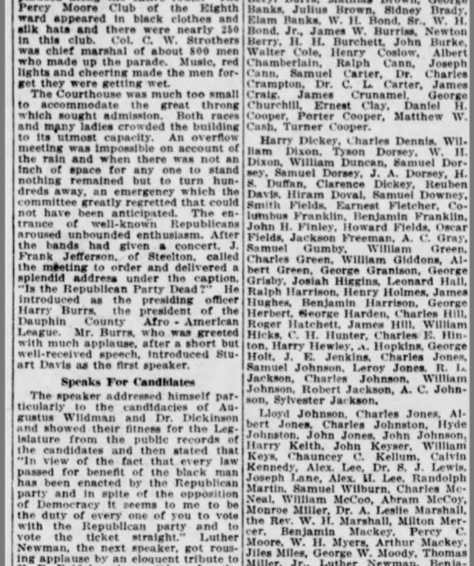 My Contribution: I was a life-long resident of Harrisburg who worked for abolitionist causes before the Civil War and fought for Black political and social rights after it. I frequently represented the Eighth Ward as an active member of the local Republican party, serving in leadership positions in political organizations including the Eighth Ward Republican Club and the Eighth Ward Garfield Arthur Club. I planned the celebration of the Fifteenth Amendment for the Harrisburg community.