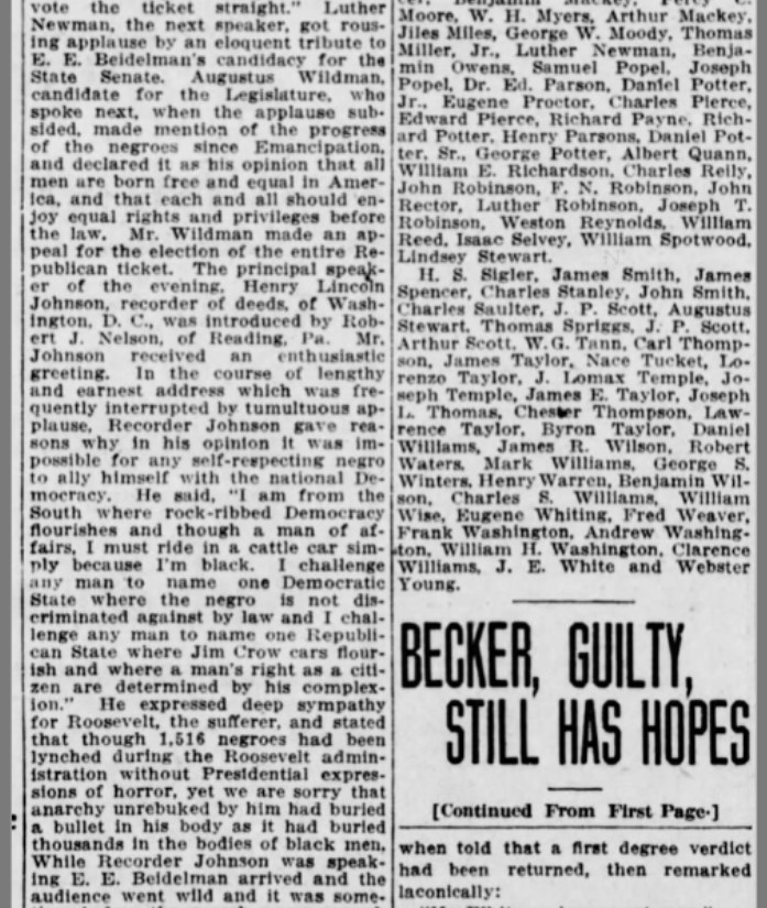 Connection to the Old Eighth Ward: Resident. One of the most politically active members of the community who represented the Eighth Ward in political affairs, especially in conventions and meetings of the local Republican party.