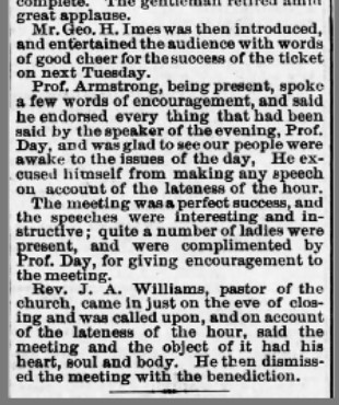 Garfield and Arthur Club often held in Franklin Hall on South Street (vice president and president pro temp); Eighth Ward Republican Club (president); planner for gala celebrating the Fifteenth amendment; Brotherly Love Lodge (parade chief marshal); Apolia Baseball Club (secretary); Union Republican Central Club (president); Union of Sabbath School Workers.