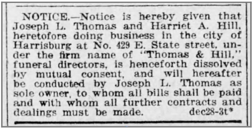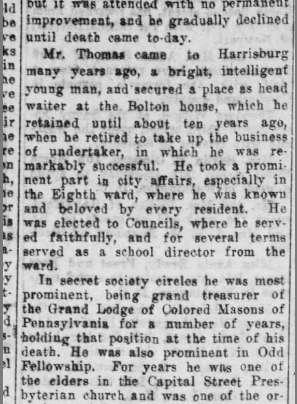 Connection to the Old Eighth Ward: Resident; funeral services for Eighth Ward and elsewhere in Harrisburg; enumerated the population for the federal census.