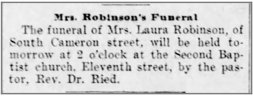 Family Members: Husband: Marshall Rob- inson. Children: Robert Robinson, Liza Robinson, Matilda Robinson, Marshall Rob- inson, Jr., Harry Robinson, Laura Robinson, John Robinson, Annie Robinson, Henry Robinson, and Rose Robinson